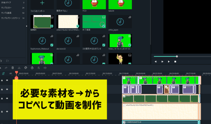 あとの作業は単純なもので、過去動画のデータ内から使いまわせるデータ(BGM・テロップ・背景など)があればコピペしてタイムライン上に貼り付けていくだけです。